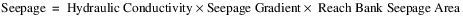 Each Reach may have horizontal seepage to multiple drains or to shallow groundwater aquifers with unique drainage characteristics. Horizontal seepage to individual drains is calculated using Darcy’s Law, as follows:
