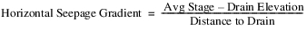 The Horizontal Gradient Seepage method requires that a Stage method be selected. It also has a dependent method category, the Drain Elevation method category. The reach horizontal bank seepage area through which seepage can flow to each drain in the horizontal direction is calculated using a stage/bank seepage area table interpolation. The horizontal hydraulic conductivity of the medium adjacent to each drain is entered by the user. The horizontal seepage gradient for each drain is calculated using the following equation: