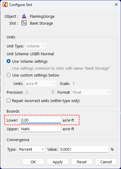 Next compute the Bank Storage but make sure it does not go below the lower bound. The lower bound is taken from the Bank Storage slot configuration as shown in the screenshot, where it is set to 0.0 acre-feet: