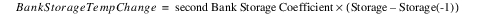 The change in Bank Storage is computed depending on the current Storage of the Reservoir. A temporary variable BankStorageTempChange is used in the initial calculations it may be adjusted later. If the Reservoir’s current Storage is greater than the previous Storage, the Storage is increasing and hence the Bank Storage should also increase. BankStorageTempChange is calculated using the following equation: