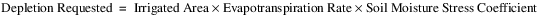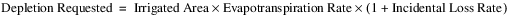 This user method uses irrigation data to determine Depletion Requested and/or Diversion Requested if they are not input. Depletion Requested is based on the area to be irrigated, evapotranspiration rate, and incidental rate loss. Diversion Requested is then calculated from the Depletion Requested and the Minimum Efficiency.