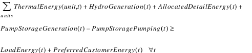 A constraint is added to meet the load. This load must be met (or exceeded) by a combination of the following power sources: thermal energy, power reservoir energy, allocated energy (from outside the basin), and net energy from pumped storage facilities (generation - pumping).