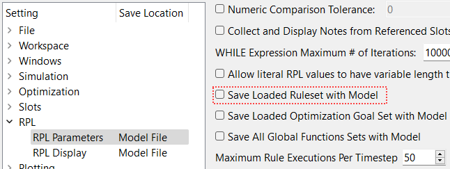 Once a custom Post-optimization Ruleset has been created, it can optionally be saved with the model file. Then the next time the model is opened, the Ruleset will automatically be opened and loaded. To save the Ruleset with the model file it must first be loaded. Then on the workspace select
