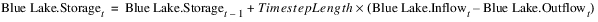 RiverWare will add the constraint shown in the goal to Optimization problem for every timestep (as a soft constraint), replacing the scalar slot Blue Lake Data.Storage Max with the actual value in the slot. Also, because this constraint references the Blue Lake Storage for every timestep, it will add the defining constraint for Blue Lake Storage, which is the mass balance constraint, for every timestep.