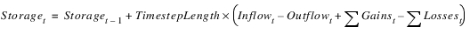 This is the defining constraint for the Storage, Inflow and Outflow variables at time t. RiverWare determines which individual variables to include in Gains and Losses depending on the method selection on the reservoir. For example, Evaporation could be an additional loss variable in the mass balance constraint. For a reach, the defining physical constraints are determined by the selected routing method.