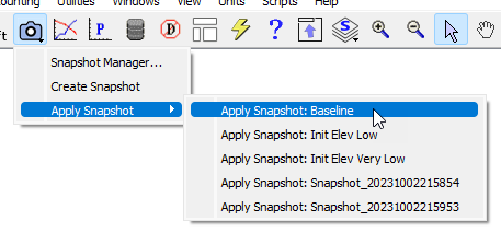 • From the main RiverWare workspace or from an open SCT, select the Snapshot button. Then in the menu select Apply Snapshot, then the desired snapshot.