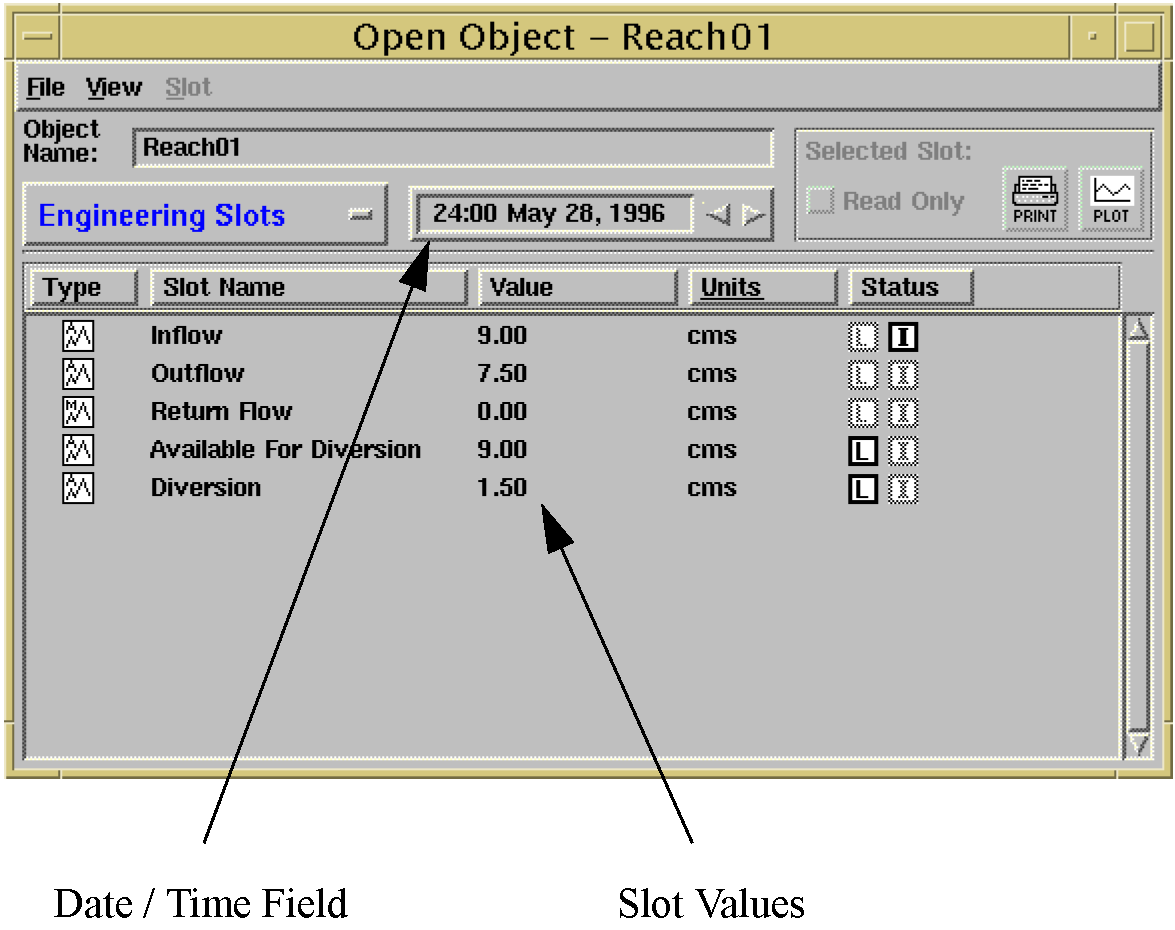 The appearance of the Open Object dialog has changed slightly. The most notable difference is the addition of a date/time field. The numbers shown in the Value field (to the right of the Slot Name field) are the slot values for the timestep expressed in the date/time field above. The left and right arrows in the date/time field can be used to move the date forwards or backwards. The number shown in the Value field will change accordingly. The figure on the following page shows the new appearance of the Open Object dialog.