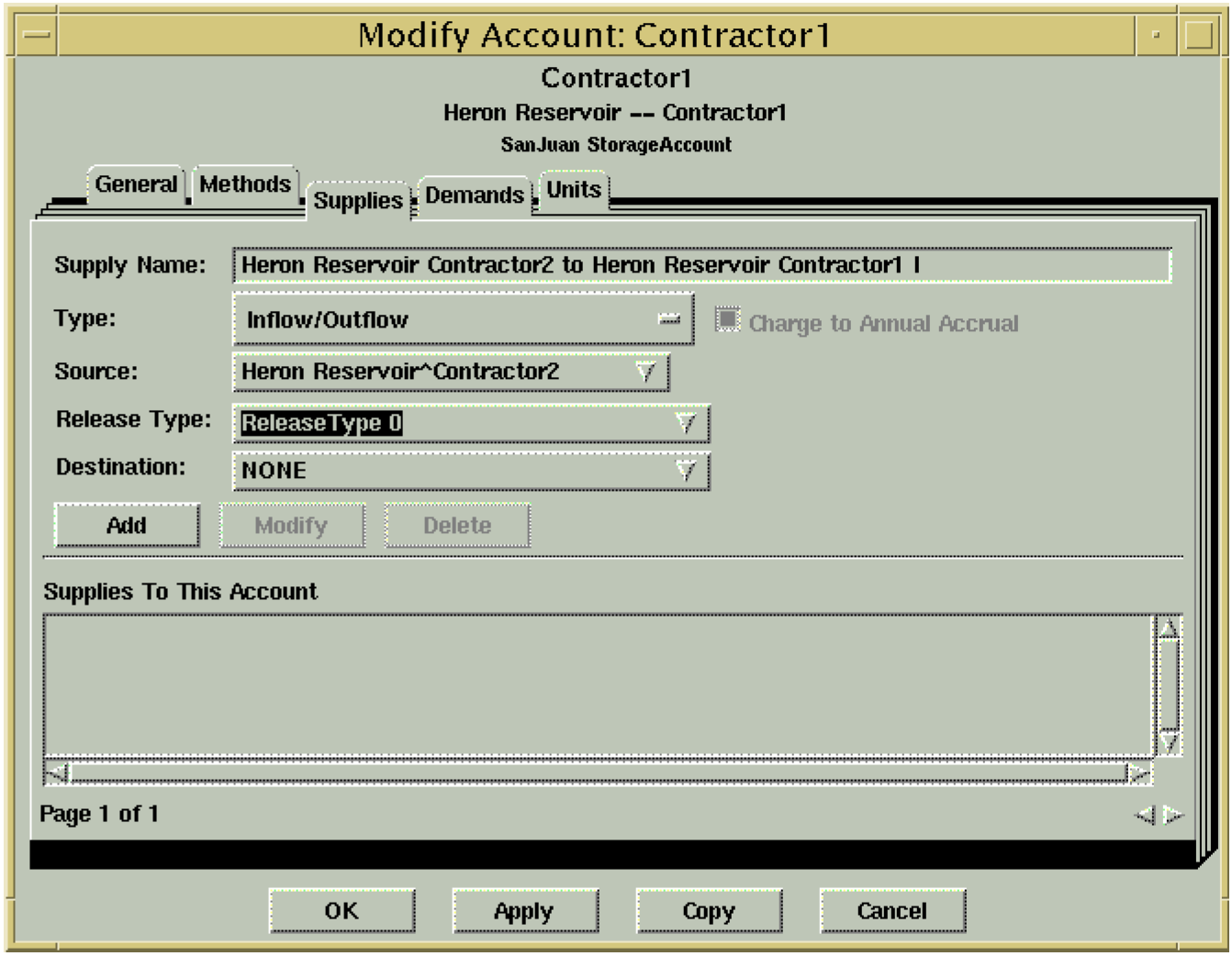 Supplies can now be assigned a release type and a destination type. Basically, this is a way to group supplies together so they can be accessed easily by rules or viewed through the Supplies Manager. This is similar to labelling an account to have a specific water type and water owner (except this applies to supplies instead of accounts). In general, a release type represents the purpose for the release and the destination type represents the ultimate destination for the release from the account. By default, all supplies have a default of NONE for both the release type and the destination types. Release types and destination types are created, deleted, and added through the Water Accounting System Configuration Dialog. This dialog is accessed by selecting Accounting->Account System Configuration from the main RiverWare menu. Once supply types have been created, supplies can be assigned a type either through the Supplies Manager or the Supplies page of the Account Configuration Dialog (see below). If using the Supplies Manager to set supply types, the types must be displayed in Column1 and Column 2 of the dialog.