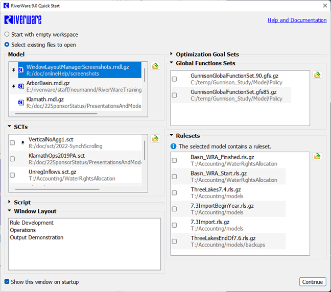 The Quick Start opens when RiverWare first opens. It allows selection of a models rulesets, SCTs, and other files. For more information, see