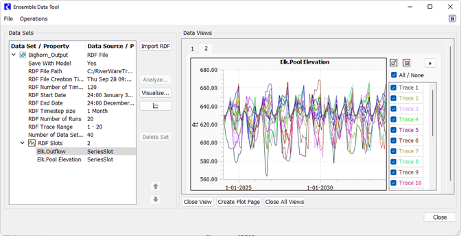 The Ensemble Data Tool (EDT) is used to visualize and analyze the RDF results of an MRM run within RiverWare. In this tool, import an RDF file created from an MRM run to create an Ensemble Data Set object. Then, plot traces and perform statistical analysis on the trace data. For more information on the EDT, see