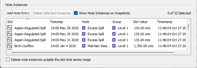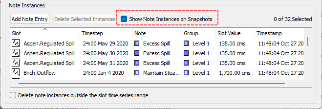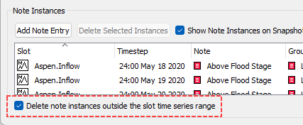 A new checkbox was added at the bottom of the Note Instances panel: Delete note instances outside the slot time series range. When checked, whenever the time range of a series slot changes, any note instances that are outside the new time range will be automatically deleted. This helps clean up out-of-date note instances that are no longer relevant as the model moves forward in time. The box is unchecked by default to maintain existing behavior.