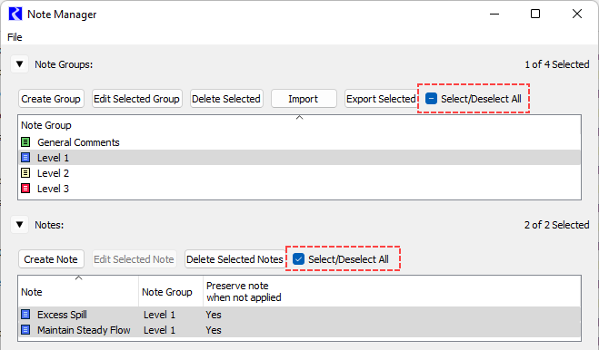 • New checkboxes were added to the Note Groups and Notes panels: Select/Deselect All. These options make it easy to quickly display all note instances.