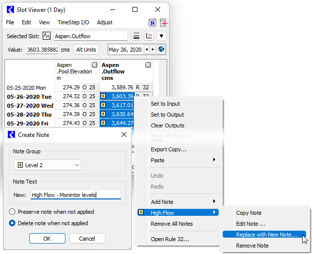 If you want to edit an existing note on a slot value from a slot, a new option is available from the right-click shortcut menu after selecting the existing note: Replace with New Note. This opens the Create Note window where you can modify the existing note text. The modified note replaces the note on the selected timesteps, and the modified note gets added to the Note Manager. Other instances of the old note remain unaffected.