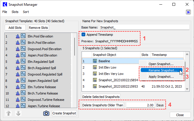 2. A new Rename Snapshot option is available from the right-click shortcut menu for a selected snapshot to allow the snapshot object name to be edited from the Snapshot Manager. Previously the snapshot object name could only be edited by opening the snapshot object from the workspace.