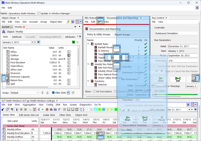 The window docking technology used in RiverWare 9.1 and 9.2 to implement Multi-Windows had limitations, such as the inability to restore tab selection and less than ideal user experience when selecting a dock location. To address these issues, an alternative windowing library was implemented. This new library provides the following features: