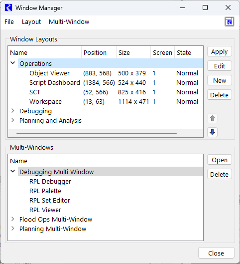 The Window Manager (previously called the Window Layout Manager), in addition to managing the sets of window layouts to be saved with the model file, now also manages a collection of Multi-Windows to be saved with the model file.