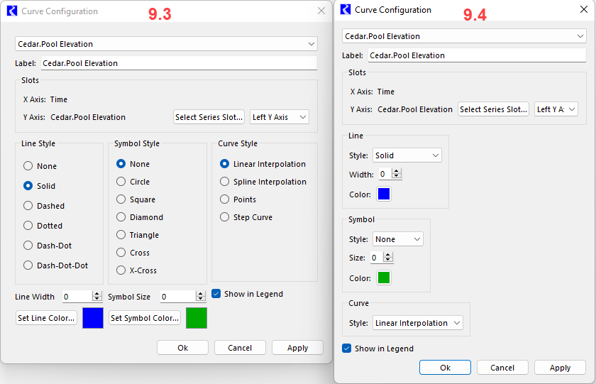 Curve Configuration window has been redesigned to make better use of horizontal space. Rather than three columns, the new version has a single column with drop-down menus. All functionality and selections in the window remain the same. See