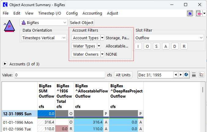 The Object Account Summary utility provides an overview of the accounting slots on a single simulation object. In previous versions of RiverWare, you could filter the accounts shown in the window by their type: Storage, Diversion, Instream Flow, or Passthrough. Now, this filtering has been expanded to include Water Type and Water Owner as shown in the figure below. In addition, the portion of the window providing controls for changing the data orientation and for filtering slots was redesigned to improve its appearance and usability, as well as to accommodate the new controls.