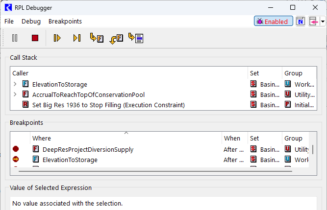 The initial size of the RPL Debugger was increased to make it easier to see more of the contents. In addition, the default widths of the columns displaying rule, goal, or function names were increased to make it easier to read the names when the Debugger opens. Also, in the Call Stack panel, the treeview is now initially collapsed to make it easier to see more of the call stack. A sample is shown in the screenshot below.