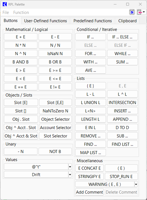 Expressions are built using the RPL Palette. The RPL Palette contains most of the expression elements needed to build a block, including logical operators, slot and object access expressions, flow operators, list operators, predefined and user made functions. See RPL Palette for details. Depending on the data type of the expression highlighted in a block, the RPL Palette only enables buttons for expressions of that data type. See Expression Data Types for details on the data types.