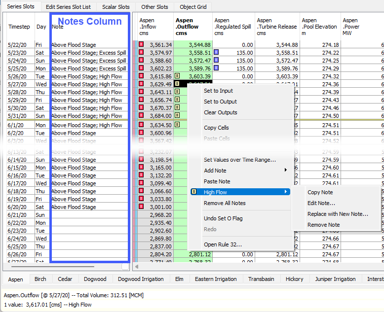 Numeric time series slot values are stored internally as double-precision floating point numbers. Cell values are displayed in the SCT, as with the rest of the RiverWare user interface, in a user-defined display precision. Display precision specifies the number of fractional decimal digits to which the internal value is rounded. The SCT uses the display precision for each slot as defined in the active unit scheme; see Unit Schemes in User Interface for details.