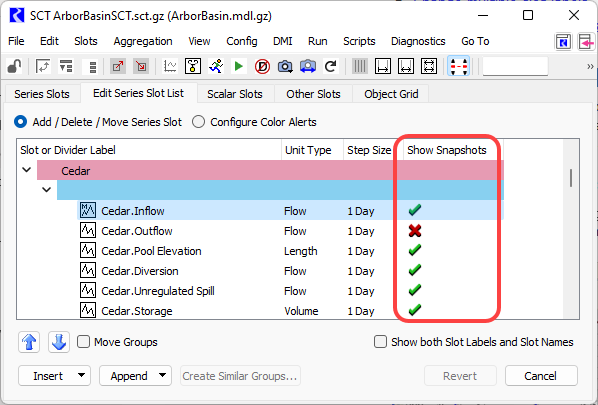 In addition, the “Show All Snapshot Slots” button can be used to show snapshot slots for the selected snapshots for all slots in the SCT, regardless of the per slot setting on the Edit Series Slot List tab. Clicking on the button again will return to showing snapshot slots based on the per slot setting.