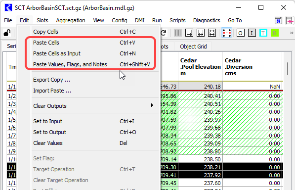 – To perform a default paste, select Edit, then Paste Cells; alternatively, press Ctrl+V. Input values are pasted as Input (I), and non-Input values are pasted as NaNs, as follows: