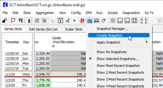 This will create a snapshot object using the Snapshot Template (slot selection and name) currently configured in the Snapshot Manager. See Snapshots in Output Utilities and Data Visualization for more information.