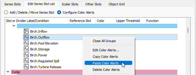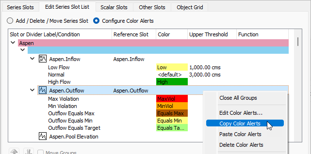 Use this procedure to copy and paste Color Alert configurations from one slot to others. This procedure simplifies the process of defining Color Alerts for multiple slots; you can copy Color Alert configurations from one slot and paste them to one or more others, and then edit the copied Color Alert configurations to fine-tune the settings.