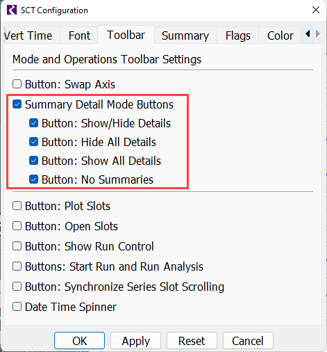 – To show one or more detail mode buttons, select the Summary Detail Mode Buttons check box. Select the check boxes of the buttons you want to include, and clear the check boxes of the buttons you want to hide.