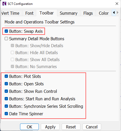 The SCT Configuration window opens at the Mode and Operations Toolbar Settings tab.