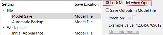 If more than one user is working on a model, then you may want to lock the model when open to prevent others from simultaneously changing the file. To do this, use the File, then Model Save and Lock Configuration menu. This opens the Settings Manager: