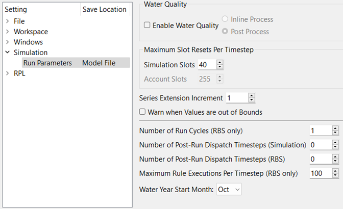 The Number of Post-Run Dispatch Timesteps parameter represents the number of timesteps past the run finish timestep for which object dispatching will be allowed. Whether an object dispatches or not still depends on the knowns and unknowns, i.e. the dispatch conditions. Also, additional data may be required for the objects to correctly dispatch and solve. Data defaults (like reservoir diversion) will be set past the end of the run, too. Note, the Number of Post-Run Dispatch Timesteps is controller specific, that is, it can be different for the Simulation and Rulebased Simulation controllers.