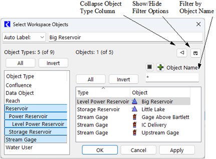 The Object Name filter field allows the user to type a part of the object name and use wildcard symbols (i.e. *) for name completion. For example, typing Lake* in the Object Name field will display only those objects that begin with “Lake”. By default, a * exists in the Object Name field and all objects will be displayed.