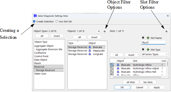 Name Uniqueness | When selecting slots on multiple objects, this filter will only show the first instance of a slot name. For example, on two reservoirs, it will only show the first reservoir’s Storage slot. | |