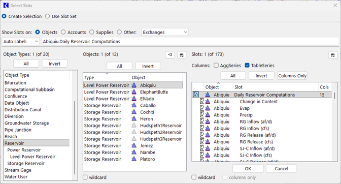 Selecting slots is one of the most common operations in RiverWare, whether for plotting, snapshots, or DMI’s. To select a slot, you must also select an Object, so the Selecting Objects section is relevant here too.