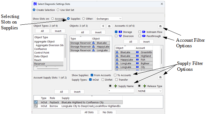 When selecting supplies (accounting links), the selection operation is as follows: Object Type, then Objects, then Accounts, then Supplies. The dialog for selecting supplies is similar to the dialog for selecting slots on accounts. The same filtering options exist for object type, objects, and accounts (see the previous sections for these details). However, the section of the dialog for selecting supplies is a bit different. The user has the option to either show supplies from the specified accounts or to the specified accounts. Then supplies can be filtered based on Supply Types, Supply Name, Release Type, Destination, and Supply Role.