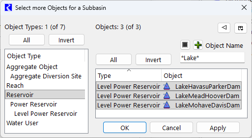 In this example, we will use the selector to create a subbasin of all of the reservoir objects with the word “Lake” in their name.