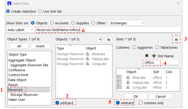 2. In the center pane, Objects, select the Wildcard button on the bottom center (2). This specifies that we will do this for any reservoir.