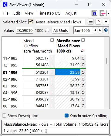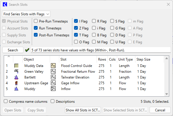 The Slot Viewer is an ad hoc tool to view multiple series slots in a single window. There is one Slot Viewer per timestep size in a RiverWare session. The slots shown and order is not persistent in any way on the viewer. Each time a Series Slot is opened from anywhere in RiverWare, it is added as a column to the Slot Viewer. From the Slot Viewer, any slot can be shown also in the slot's conventional Slot window.