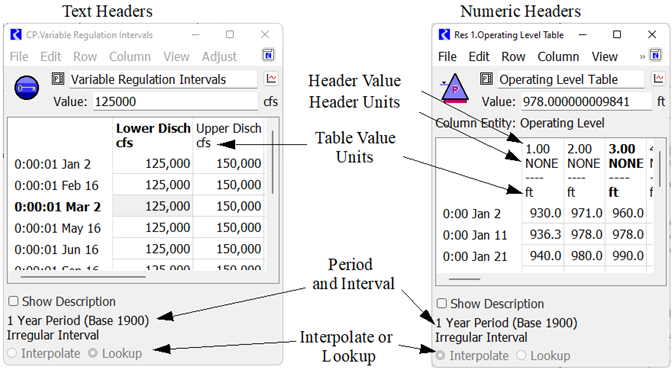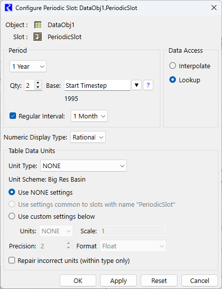 Periodic Slot | | Table | A specialized table slot, the periodic slot is used to hold data that repeats over a specified time period. For example, a set of monthly evaporation coefficients for a reservoir (the same every year), could be held in a periodic slot. The timeseries associated with the data can vary (1 Hour, 1 Day, 1 Month, etc.) as well as the period over which the data repeats. The periodic slot can also handle irregular timeseries and can have either text or numeric column headings. |
