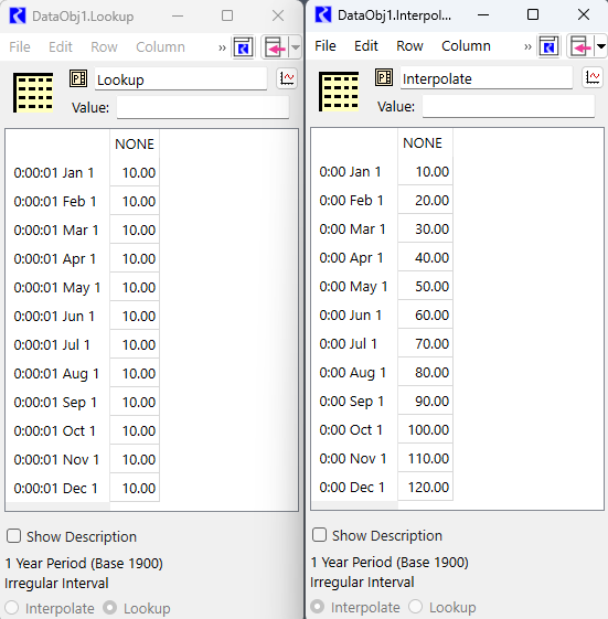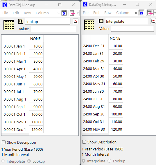 – Interp. Linearly interpolate between the values on the larger timestep. This is useful when the values change linearly over the disaggregation period. For example, Pool Elevations can be assumed to change linearly from one larger timestep to another.