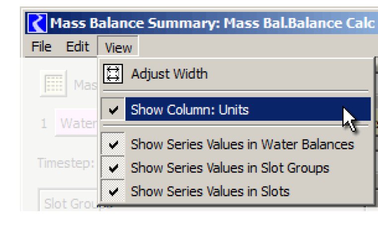 All Mass Balance Summary configuration information is stored on the Mass Balance Summary Slot. This is applied both in the RiverWare model file and in Export files.