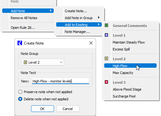 • Replace with New Note—This opens the Create Note dialog to allow you to add to or modify the selected note. When the Create Note dialog is opened from the SCT, the option to Delete note when not applied will be selected by default. If you want the note to remain in the Note Manager even if it is no longer applied for any note instances, so that it can be selected for later use, select the option for Preserve note when not applied. When you select OK, the modified note replaces the note on the selected timesteps, and the note gets added to the Note Manager as a new note. This option will affect only the note instances on the selected timesteps.