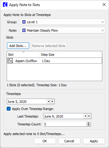 When either of these options is selected, the Apply Notes to Slots window will open. When the Add Note Entry Using Context button was selected, the slot list in the middle panel and the timestep in the bottom panel will already be populated based on the context shown at the bottom of the Note Manager, which comes from the slot and timestep from which the Note Manager was opened.