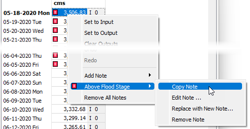 2. In the Slot Viewer or slot dialog, right-click on the timestep with the desired note.When one or more note instances exist on a particular Slot/Timestep, the right-click shortcut menu on the cell includes a menu for each note. Move the cursor over the desired note in the shortcut menu; then select Copy Note.