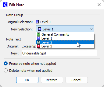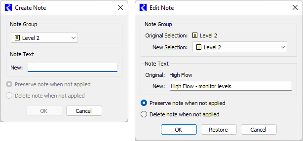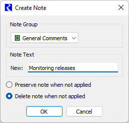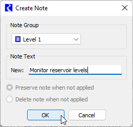 6. Select the desired option for Preserve/Delete note when not applied. When the Delete option is selected, the note will be deleted from the Note Manager if it is no longer applied for any note instances. This can be useful to prevent old notes from accumulating in the model. The Preserve option will cause the note to persist even when it is not applied for any note instances. This allows a preconfigured note to be available to apply at a later time.
