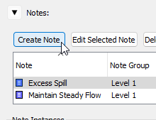 Notes are short text strings that are associated with one or more timesteps. Each note belongs to a Note Group. Each note has a list of associated slots and the timesteps to which they apply. Each specific application of a note on a slot timestep is referred to as a note instance. The Note Manager utility facilitates creation and management of notes and Note Groups. The display icon for each group can be assigned a color.