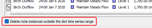 Tip: By selecting the checkbox for Delete note instances outside the slot time series range, any note instances on timesteps that no longer exist on the slot will be automatically deleted whenever the slot time series range changes. This option can be used to prevent out-of-date notes from accumulating in the Note Manager as the model moves ahead in time.