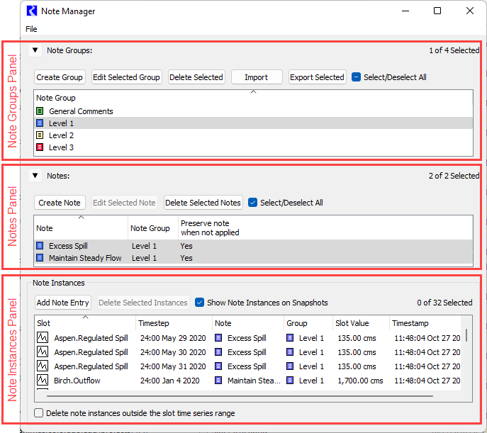 The Delete note instances outside the slot time series range option at the bottom of the Note Instances panel can help prevent old note instances from accumulating in the model. By default this option is not selected. When this option is selected, if the time range of a slot changes, any note instances that are outside the new time range of the slot will be automatically deleted from the Note Manager. This setting is saved in the model file.